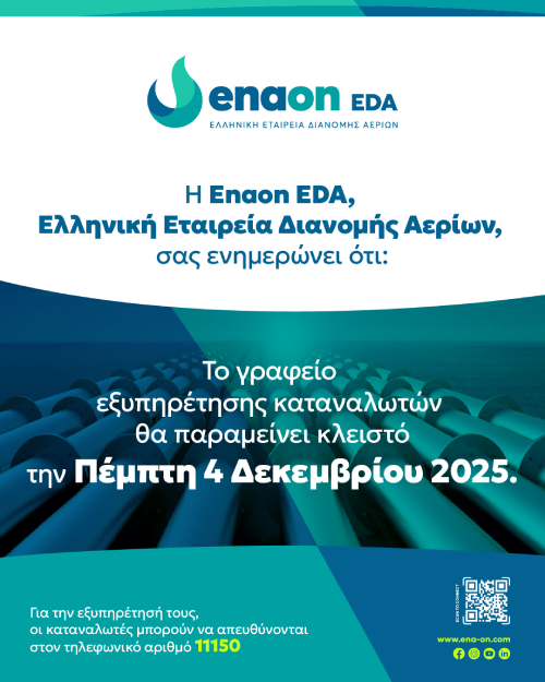 Η Enaon EDA, Ελληνική Εταιρεία Διανομής Αερίων, σας ενημερώνει ότι το γραφείο εξυπηρέτησης καταναλωτών θα παραμείνει κλειστό την Πέμπτη 4 Δεκεμβρίου 2025.